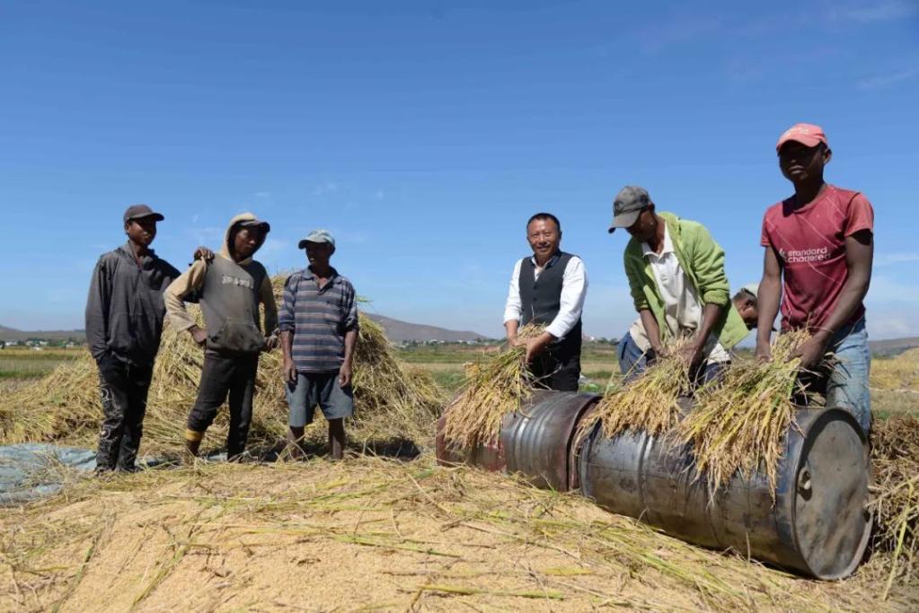 2023年5月12日,在馬達加斯加首都塔那那利佛附近的馬義奇鎮,中國雜交水稻技術專家胡月舫(右三)在中國國家雜交水稻工程技術研究中心非洲分中心的試驗田里和當地農民一起收割水稻。新華社發(西塔卡·拉喬納里松 攝)