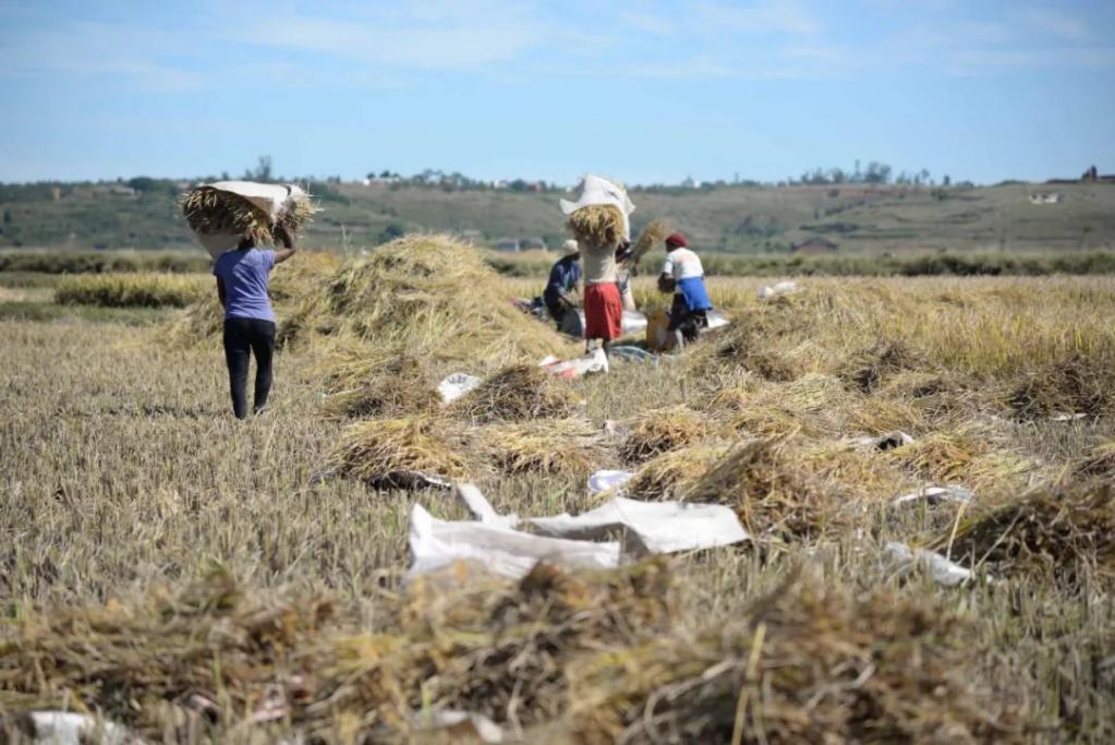 2023年5月12日,在馬達加斯加首都塔那那利佛附近的馬義奇鎮,農民在中國國家雜交水稻工程技術研究中心非洲分中心的試驗田里收割水稻。新華社發(西塔卡·拉喬納里松 攝)