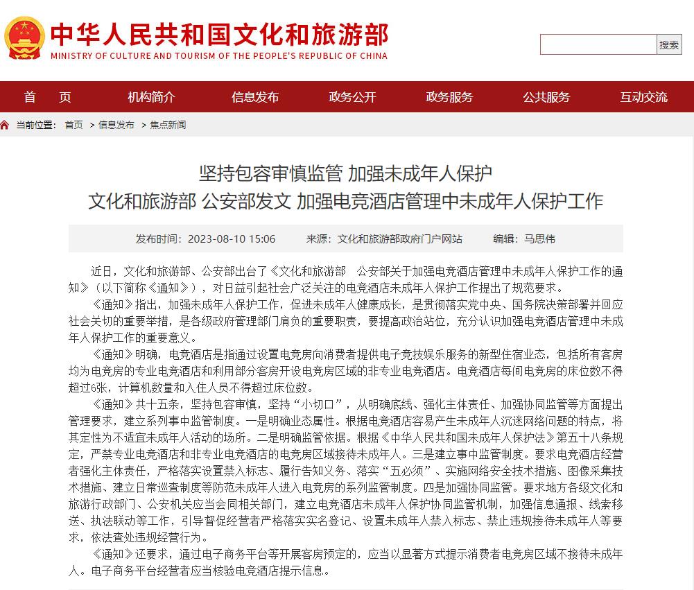 近日,文化和旅游部、公安部出臺了《文化和旅游部 公安部關于加強電競酒店管理中未成年人保護工作的通知》(以下簡稱《通知》),對日益引起社會廣泛關注的電競酒店未成年人保護工作提出了規范要求。