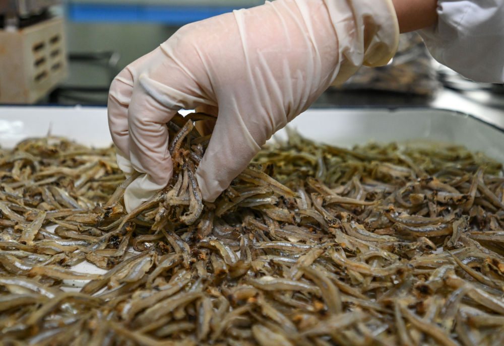 2023年6月28日,在湖南省岳陽市平江高新技術產業園,勁仔食品平江生產基地的化驗員在實驗室對進口鳀魚進行水分檢測(陳曄華攝)