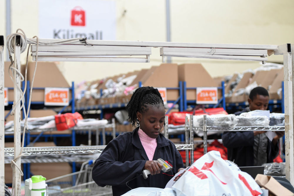 2023年7月28日,在肯尼亞姆洛隆戈,湖南長沙非拓信息技術有限公司旗下電商平臺Kilimall的員工在倉庫內分揀貨物。(李亞輝 攝)