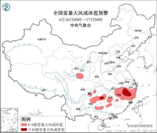預計4月16日08時至17日08時,甘肅南部、安徽南部、湖南中西部和南部、江西中北部、浙江中南部、福建北部、四川北部、重慶中南部、貴州中北部、廣西北部等地的部分地區將有8-10級雷暴大風或冰雹天氣,局地可達11級以上;安徽南部、湖北西部和東南部、湖南中北部、江西中北部、浙江中南部、福建西北部、四川東北部、重慶、貴州中東部、廣西東北部等地的部分地區將有短時強降水天氣,最大小時雨量30-60毫米,局地可達70毫米以上。