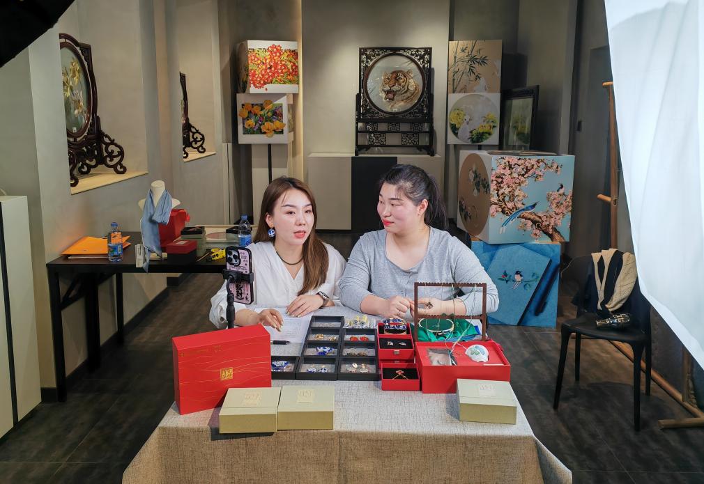 湖南省湘繡研究所的青年員工在直播間介紹湘繡產品。新華社記者白田田 攝