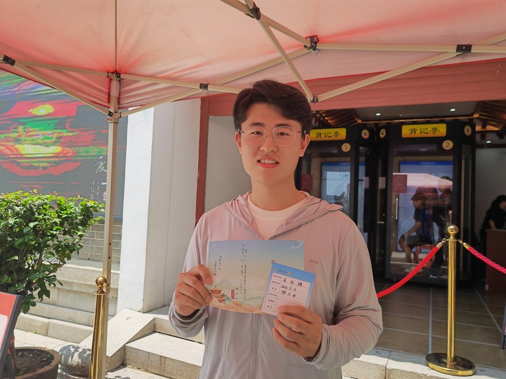 在國家5A級旅游景區岳陽樓門旁的智能背記亭,26歲的游客張江北通過背誦《岳陽樓記》,經數字人評定,得分100分,獲得“本人免票獎勵”。從高中初學此文到研究生畢業,多年過去,他依然能夠流利背誦。