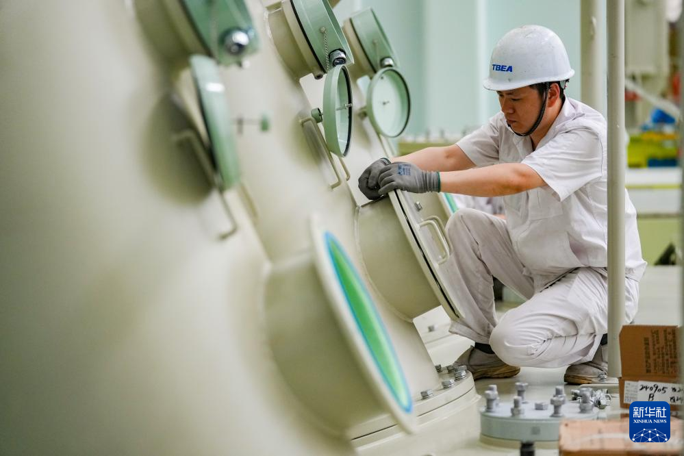 5月8日,在湖南省衡陽市雁峰區一家輸變電企業,工人在裝配車間檢查變壓器(無人機照片)。