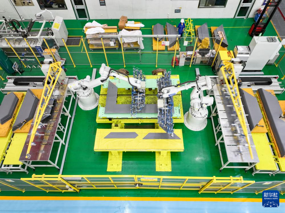 5月8日,在湖南省衡陽市雁峰區一家輸變電企業,機械臂在裝配車間作業(無人機照片)。