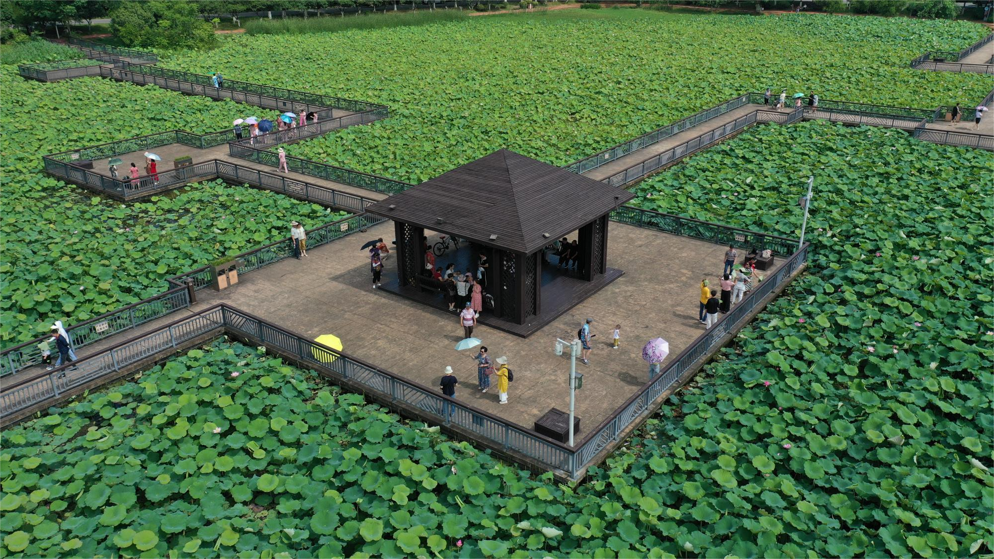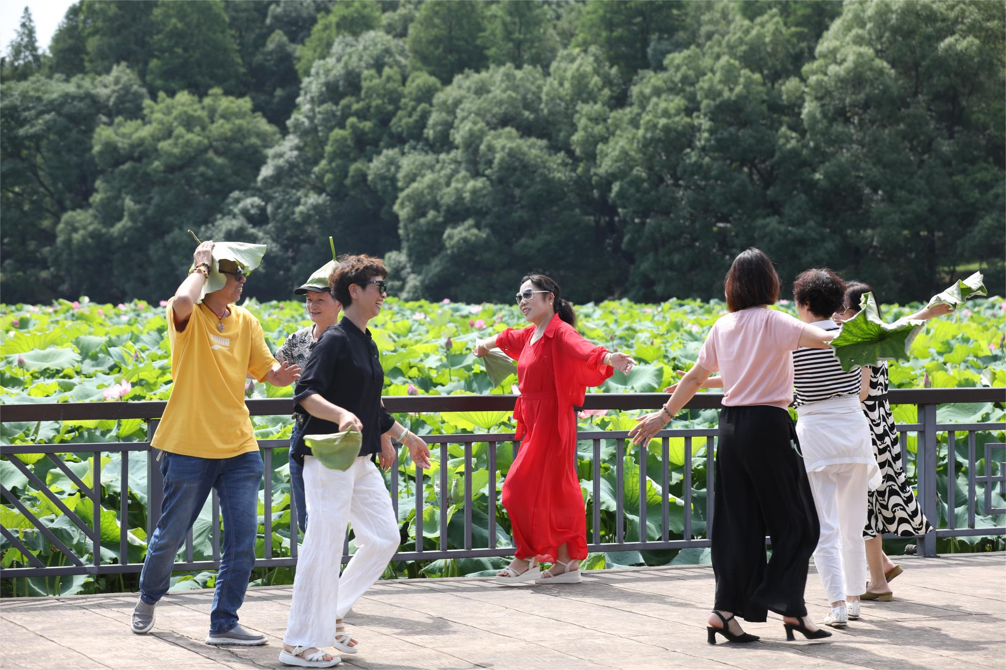 6月16日,游客在衡陽市雁峰區南湖公園荷花棧道上歡快地跳著舞蹈。