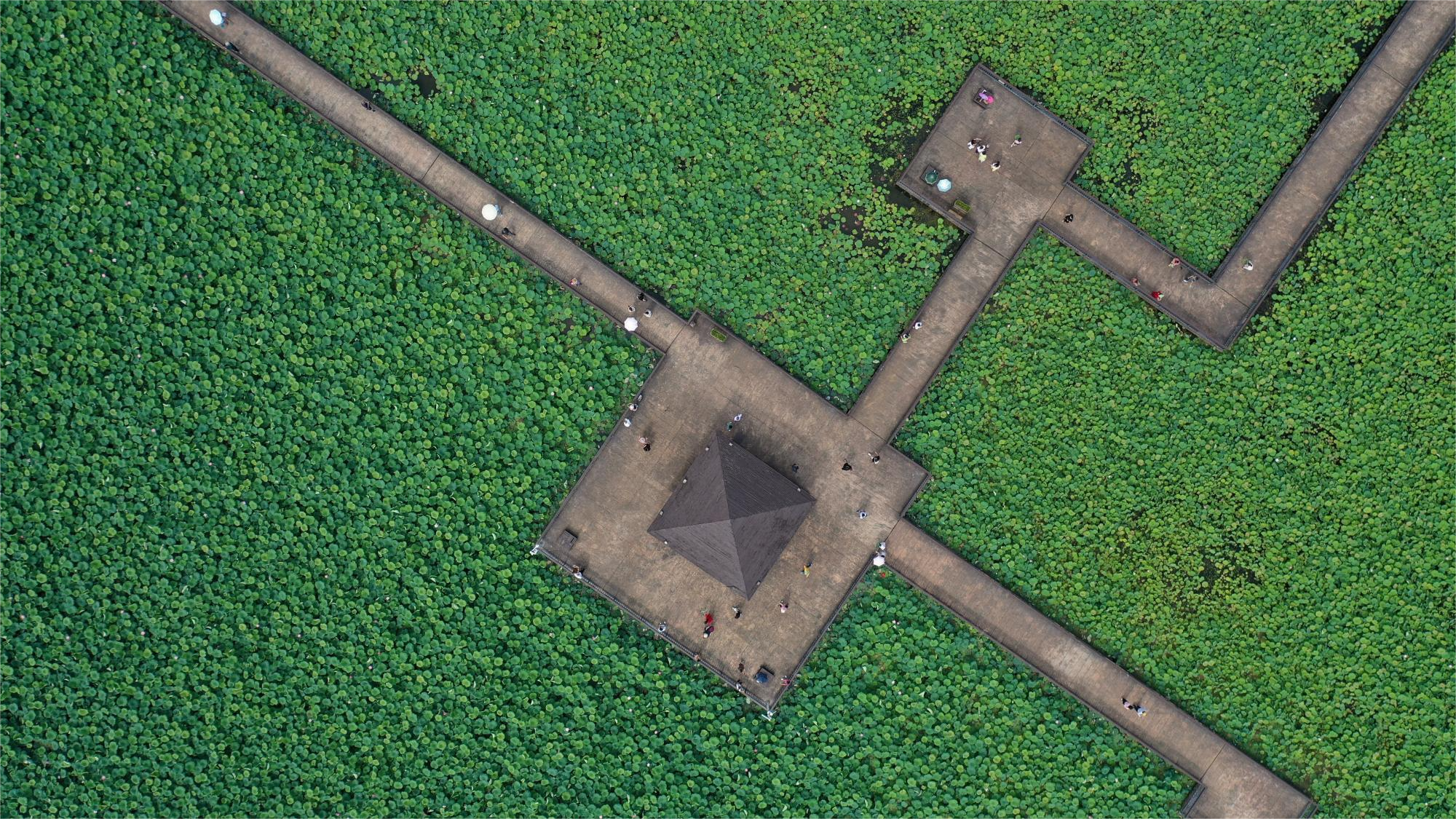 6月16日,衡陽市雁峰區南湖公園內翠綠的荷葉鋪滿整個湖面。