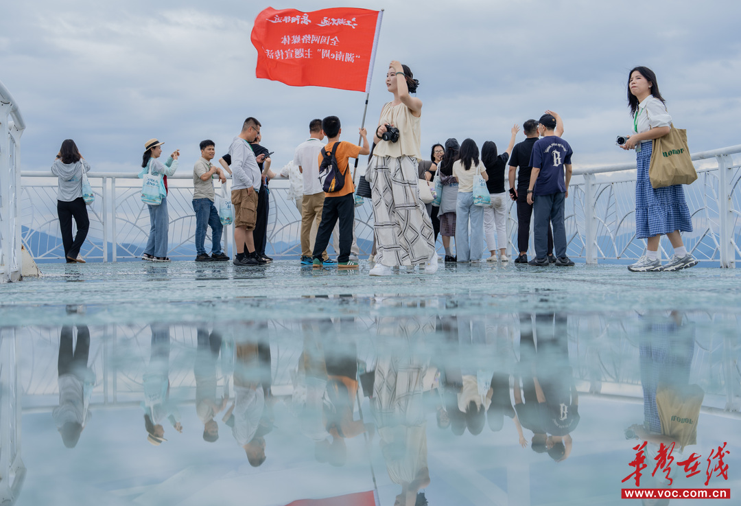 世界最大“三葉草”玻璃高空觀景平臺“懸崖天眼”傲立牛頭頂,它懸挑58.5米、寬79.3米、高320米,擁有415平方米的載員面積,外形似明珠耀于峰巔。登上觀景臺,眼前是云霧騰繞的天空,向下可俯瞰國內首屈一指的白玉丹霞地貌群落,氣勢磅礴、壯觀無比。采訪團記者們踏上這絕壁之上的天眼,迎著山風,對著無人機揮手吶喊,歡聲笑語與壯麗景色交融,繪就絕美畫卷。