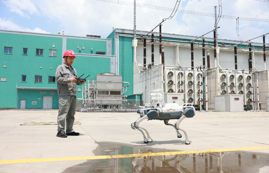 在±800千伏特高壓韶山換流站內,運維人員正在操作機器狗進行設備巡視,確保站內設備安全穩定運行。國網湖南電力 供圖