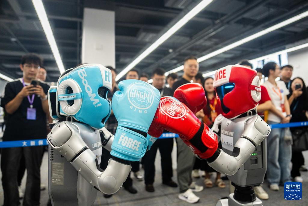 9月15日,在湖南湘江新區長沙智谷,兩臺人形機器人在進行拳擊表演。新華社記者 陳思汗 攝pagebreak