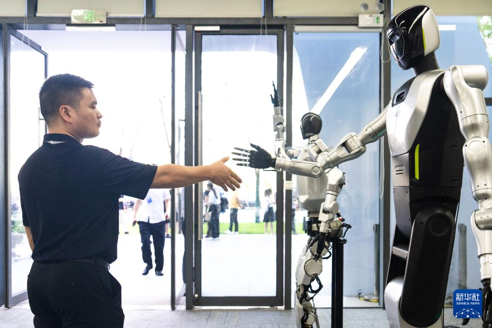 9月15日,在湖南湘江新區長沙智谷,觀眾與人形機器人握手。新華社記者 陳思汗 攝pagebreak