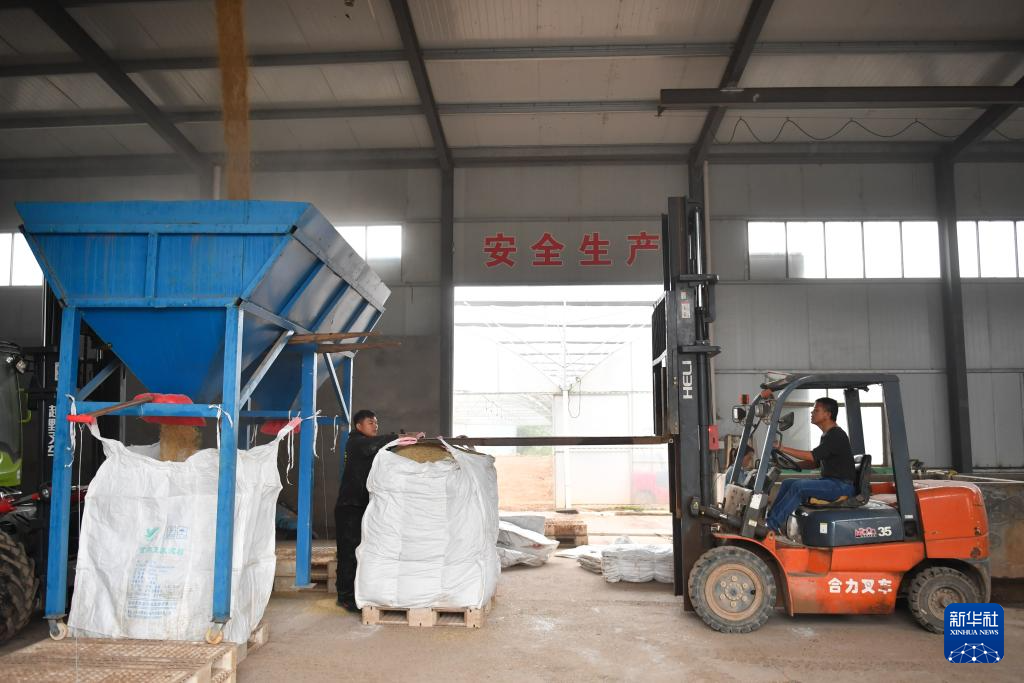 10月30日,邱彬(左)和父親邱國清將烘干后的稻谷裝袋。新華社記者 陳振海 攝pagebreak