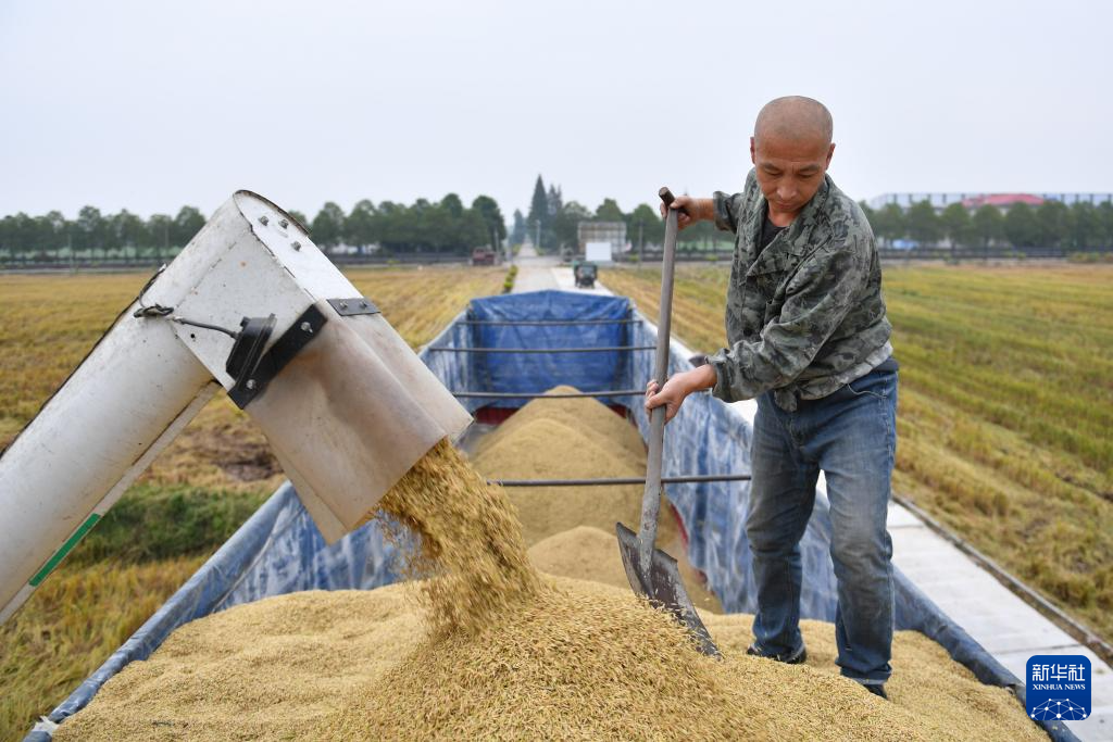10月29日,在大通湖區河壩鎮王家湖村,農機手將稻谷裝車。新華社記者 陳振海 攝pagebreak