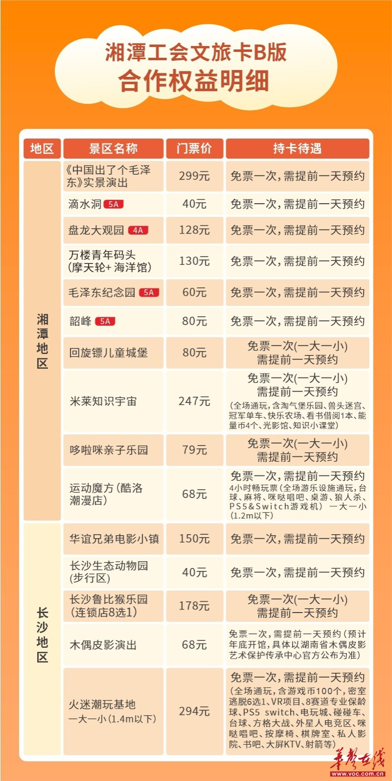 與往期不同的是,本期活動將集中發放“定向文旅券”。中簽會員可獲得“湘潭工會文旅票”(分A、B版,二選一),針對湘潭工會文旅票對應的景點憑票都可免費入園一次。 活動秉承公平公正原則,采用“在線報名+搖號中簽”方式。只要是錄入湖南省網上工會工作平臺的工會會員(含新就業形態勞動者),均可參與。